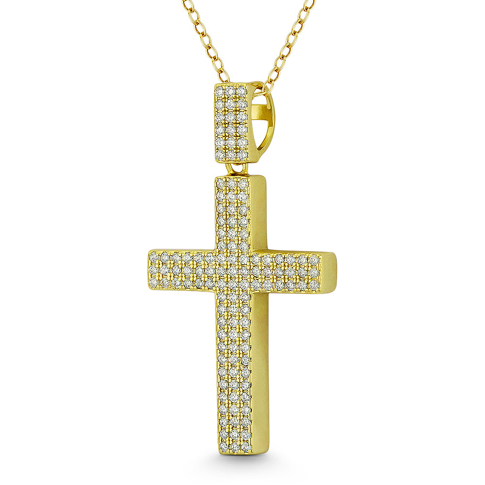 Loading... Please wait...The featured pendant is cast in 14k yellow gold-plated .925 sterling silver and showcases a classic latin cross completely paved with cubic zirconia crystals then finished with a sturdy bail that will accommodate most chain sizes.