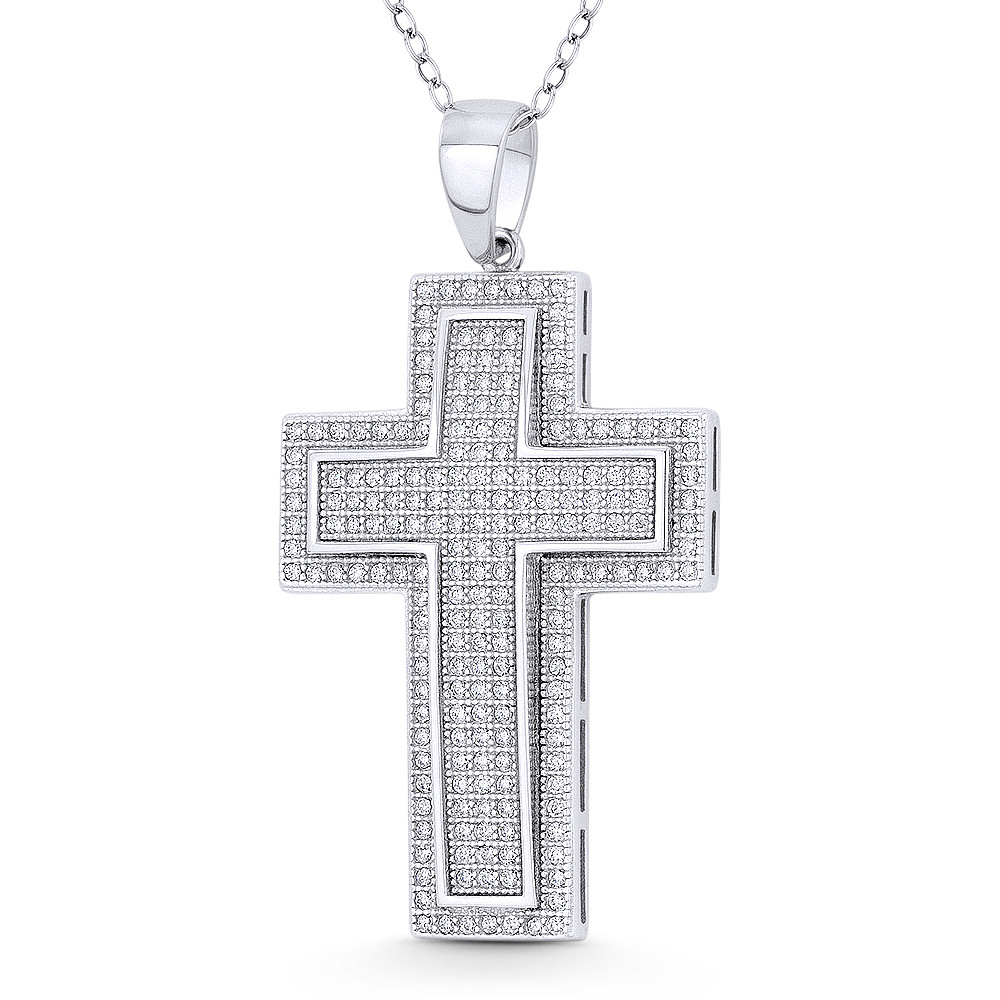 Loading... Please wait...The featured pendant is cast in rhodium-plated .925 sterling silver and showcases a classic latin cross completely paved with cubic zirconia crystals then finished with a sturdy bail that will accommodate most chain sizes.