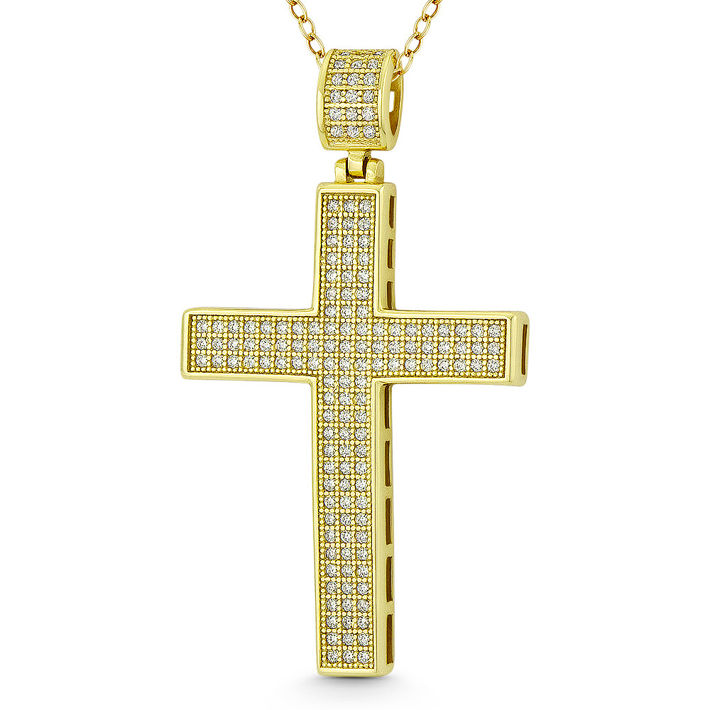 Loading... Please wait...The featured pendant is cast in 14k yellow gold-plated .925 sterling silver and showcases a classic latin cross paved with cubic zirconia crystal clusters then finished with a large & sturdy bail that will accommodate most chain sizes.