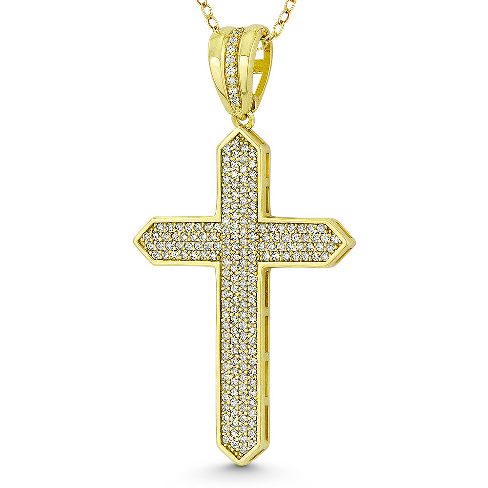 Loading... Please wait...The featured pendant is cast in 14k yellow gold-plated .925 sterling silver and showcases a passion cross paved with cubic zirconia crystal clusters then finished with a large & sturdy bail that will accommodate most chain sizes.