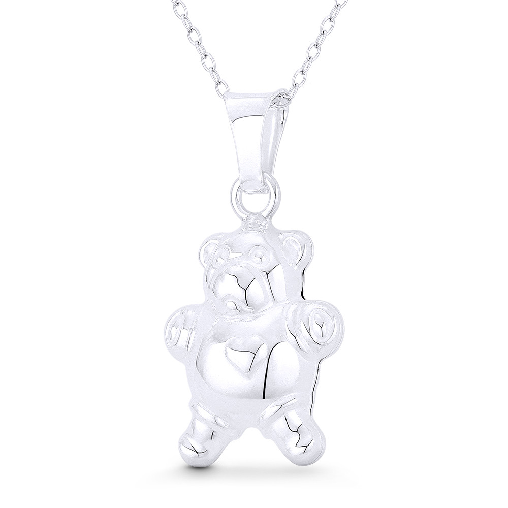 Loading... Please wait...The featured Italian-made pendant is cast in .925 sterling silver and showcases a hollow-cast 3D pot-belly teddy bear finished w/ a sturdy bail that will accommodate most chain sizes.
