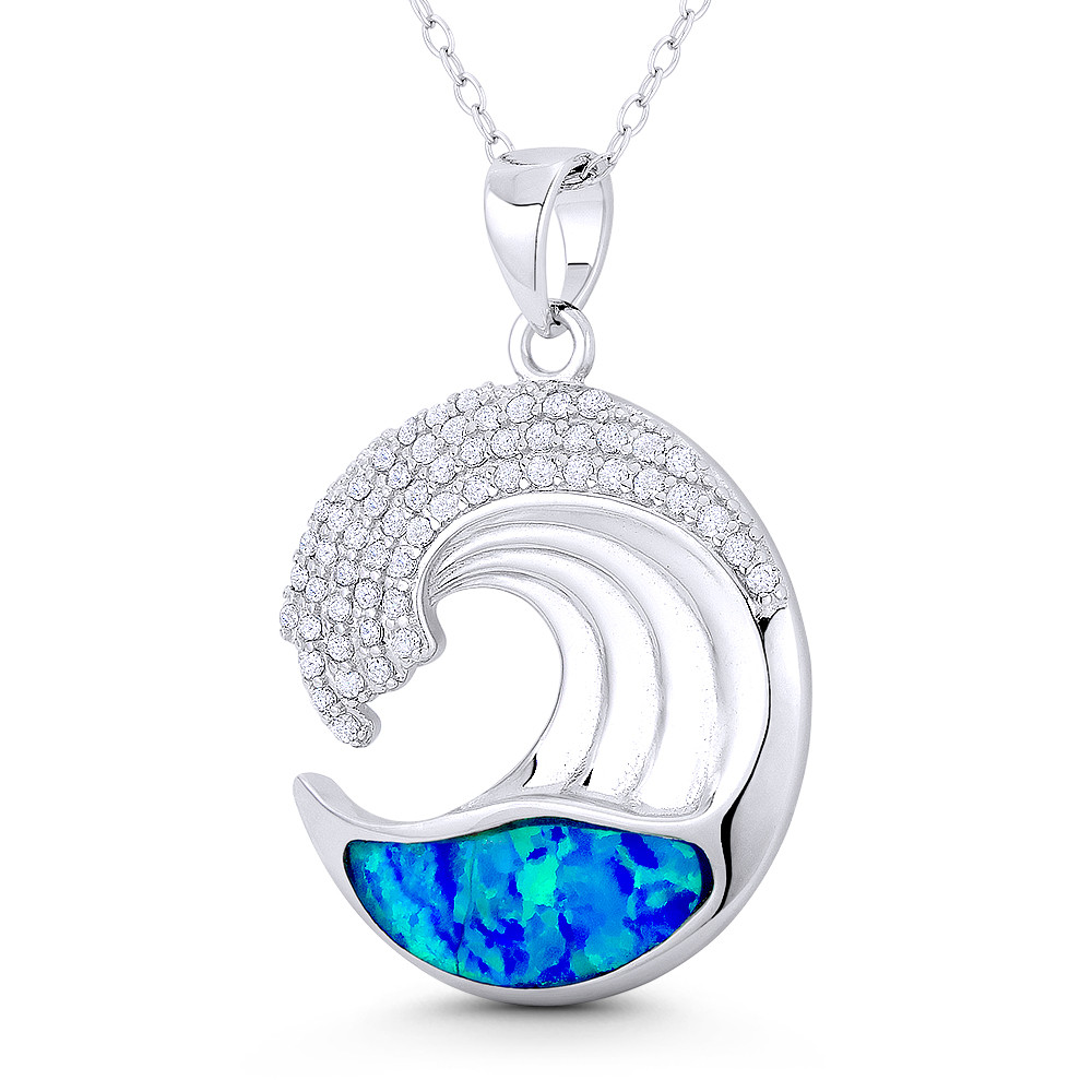 Loading... Please wait...The featured pendant is cast in rhodium-plated .925 sterling silver and showcases a sea wave design adorned with a lab-created opal & cz crystals then finished with a sturdy bail that can accommodate most chain sizes.
