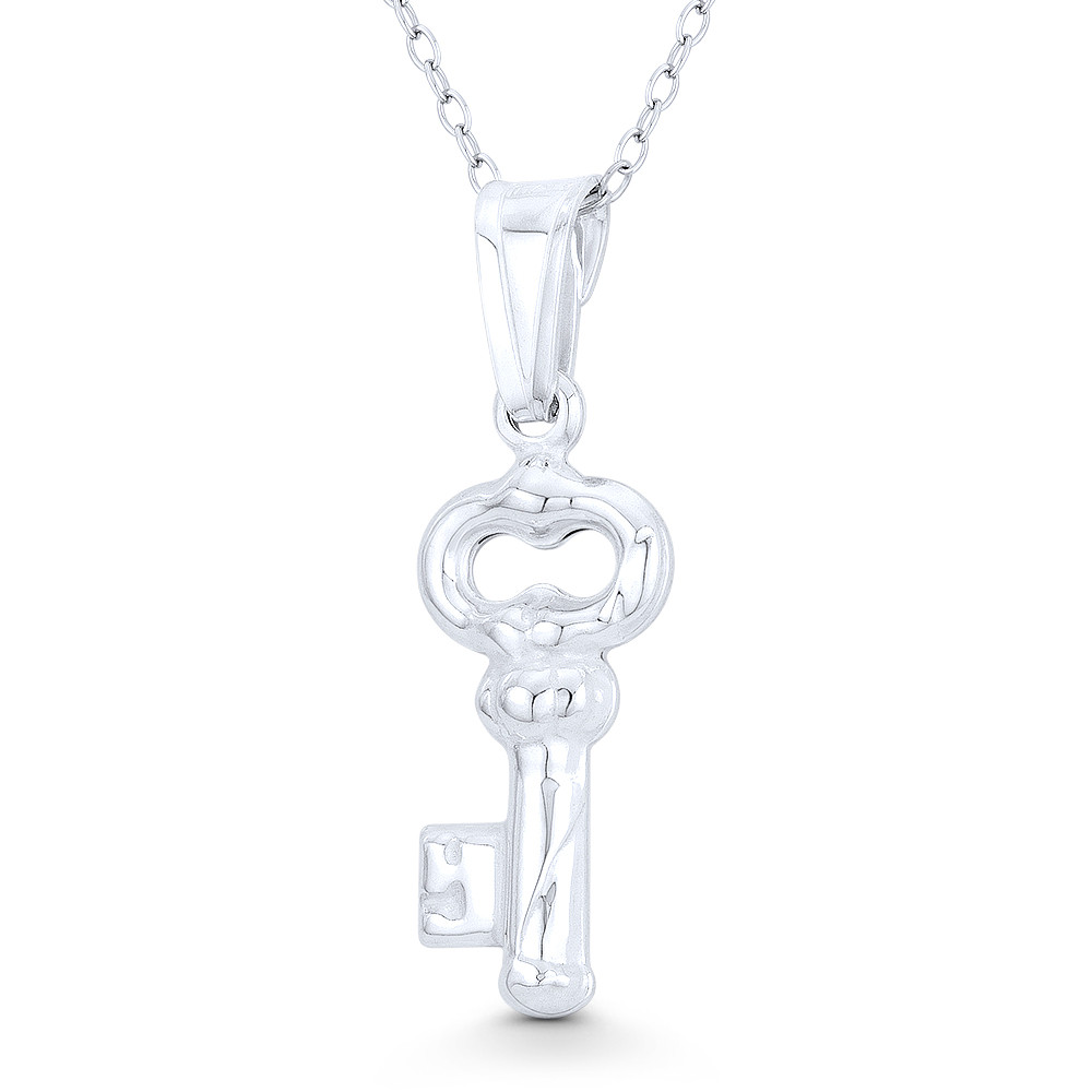 Loading... Please wait...The featured pendant is cast in .925 sterling silver and showcases a petite skeleton key design finished with a sturdy bail with a one-way latch that can accommodate most chain sizes.