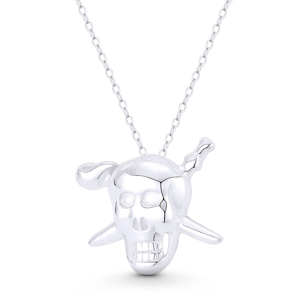 Loading... Please wait...The featured Italian-made pendant is cast in .925 sterling silver and showcases a hollow-cast skull & crossed swords finished with a back loop that can accommodate most chain sizes.