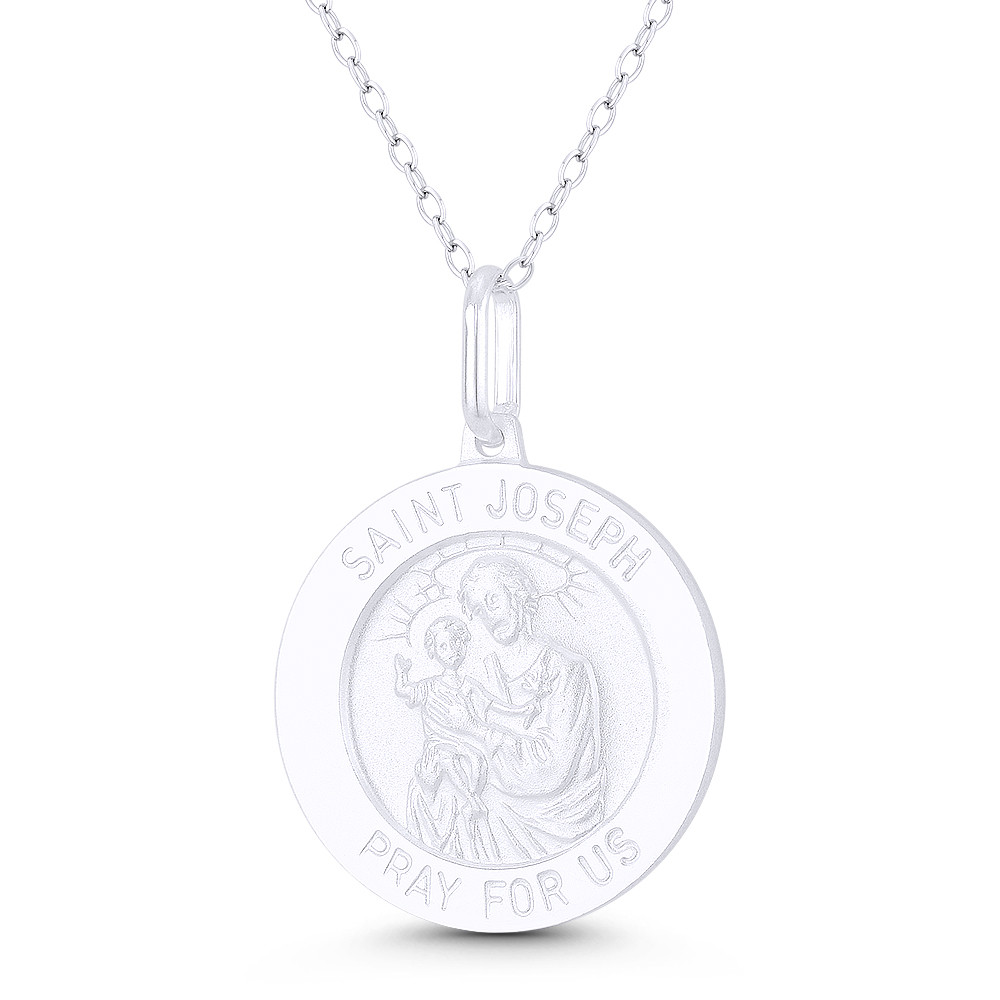 Loading... Please wait...The featured Italian-made pendant is cast in .925 sterling silver and showcases a 21mm (0.8in) round medallion detailed with an image of St. Joseph surrounded by engraved text. The medallion is then finished with a sturdy bail that can accommodate most average-sized chains.