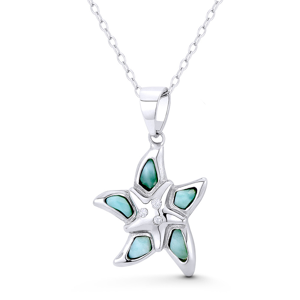 Loading... Please wait...The featured pendant is cast in rhodium-plated .925 sterling silver and showcases a starfish charm adorned with lab-created chalcedony stones & cz crystals then finished w/ a sturdy bail that will accommodate most chain sizes.