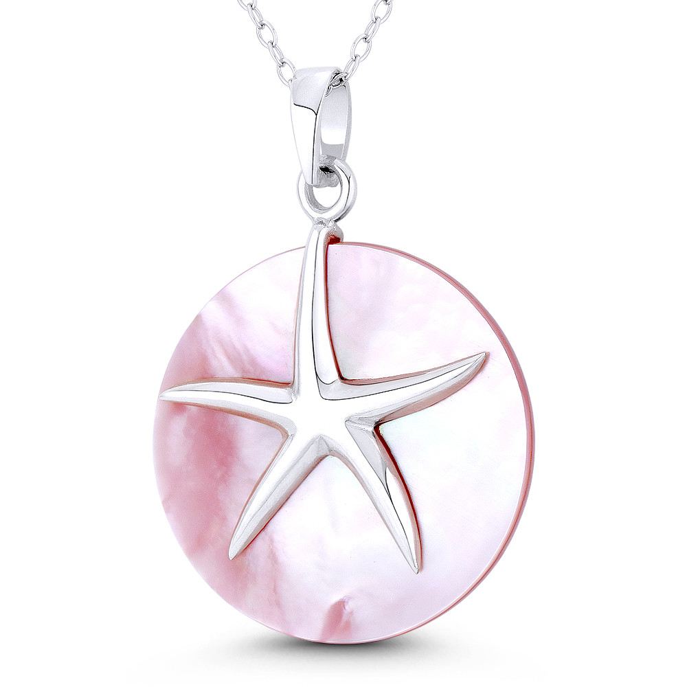 Loading... Please wait...The featured pendant is cast in .925 sterling silver and showcases a disc-shaped cultured pink mother-of-pearl held by a starfish charm then finished w/ a sturdy bail that will accommodate most chain sizes.