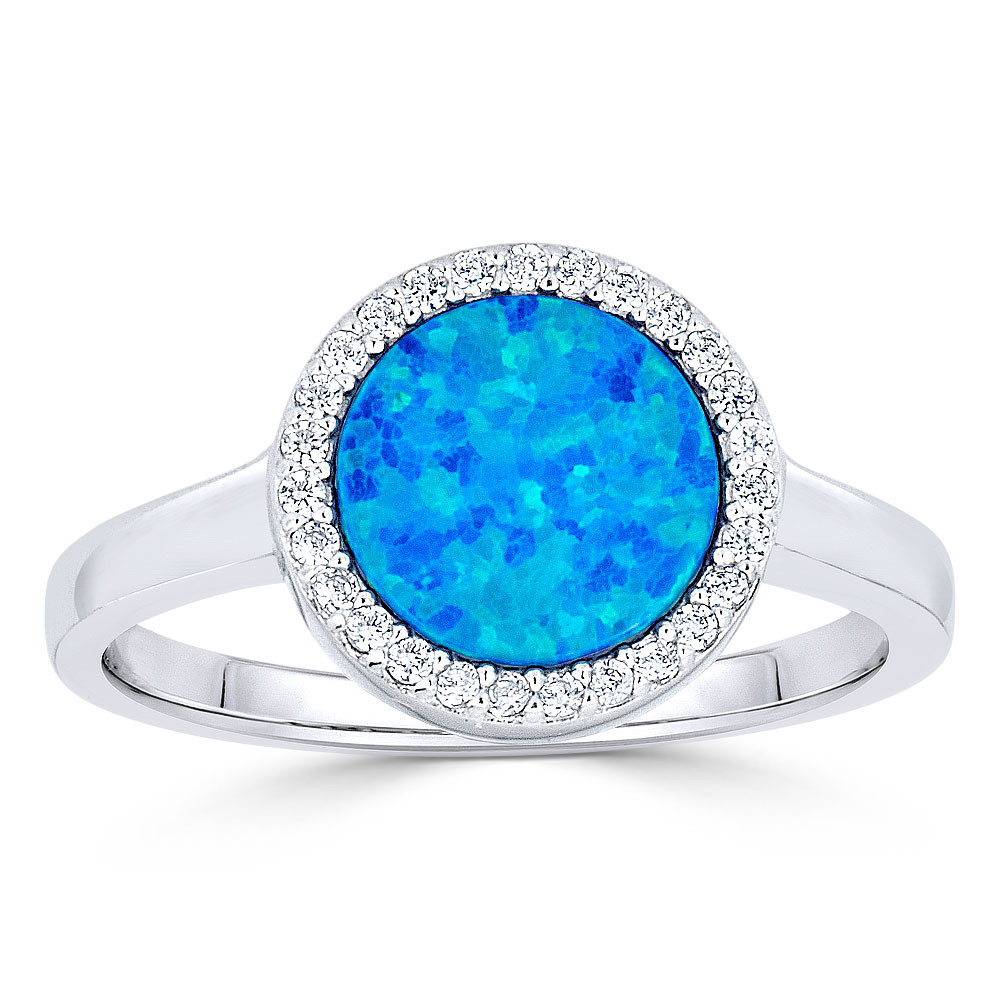 Loading... Please wait...The featured ring is cast in .925 sterling silver and showcases a round-flat synthetic opal centerstone surrounded by round cut cz crystals all the way around the halo design.
