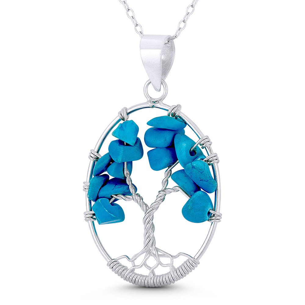 Loading... Please wait...The featured pendant is cast in .925 sterling silver and showcases a Tree-of-Life charm made from wrapped wire & synthetic turquoise gems framed in an oval outline. The finished charm is then fitted w/ a sturdy bail that will accommodate most chain sizes.