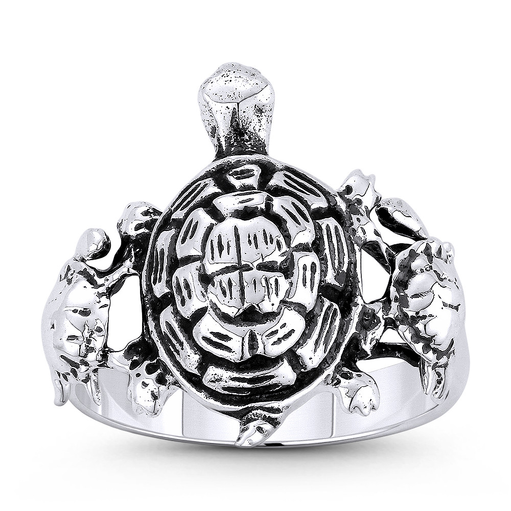Loading... Please wait...The featured ring is cast in oxidized .925 sterling silver and showcases a top-design made up of a large tortoise & 2 baby tortoises finished with a flat band for an easy fit around your finger.
