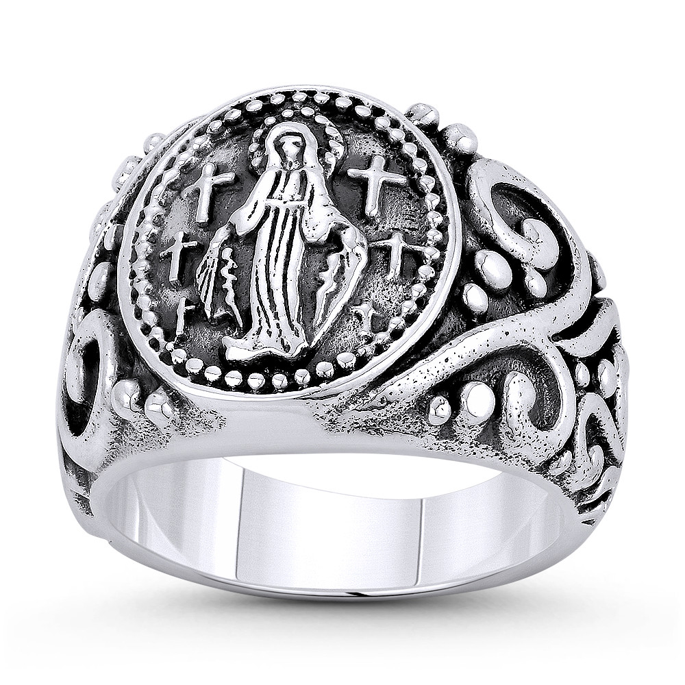 Loading... Please wait...The featured ring is cast in oxidized .925 sterling silver and showcases a signet style ring with a Mother Mary & Cross design centerpiece adorned with intricately swirling filigree details on both sides.